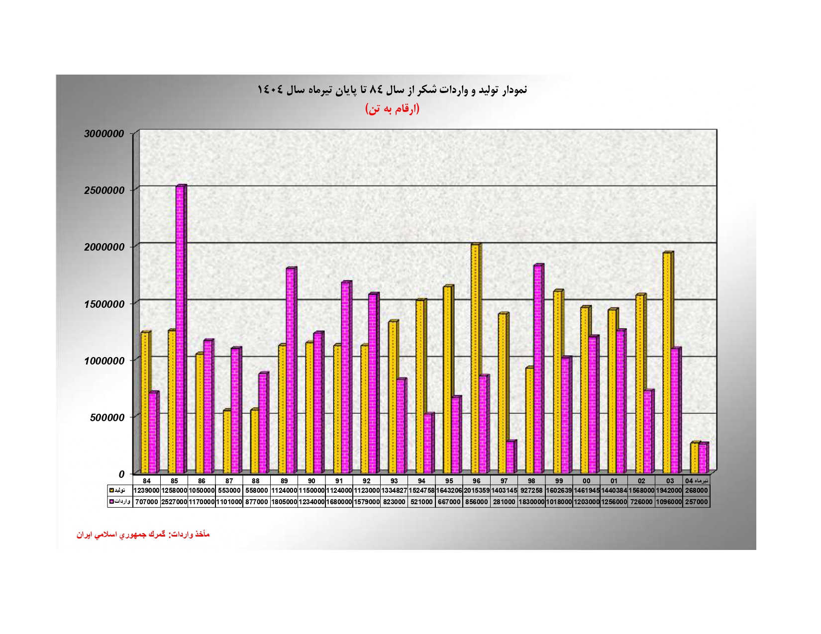 این نمودار وضعیت تولید داخلی شکر و واردات آن را طی حدود ۲۰ سال اخیر (۱۳۸۴–۱۴۰۴) به‌صورت مقایسه‌ای نشان می‌دهد. ستون‌های زرد رنگ مربوط به تولید داخلی و ستون‌های صورتی (بنفش) مربوط به واردات شکر هستند.