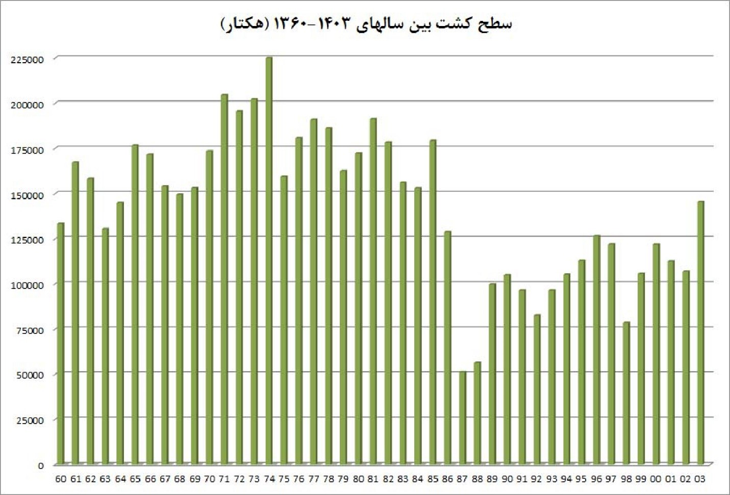 - بیشترین سطح کشت مربوط به اواسط دهه ۵۰ و کمترین آن در اواخر دهه ۶۰ ثبت شده است.