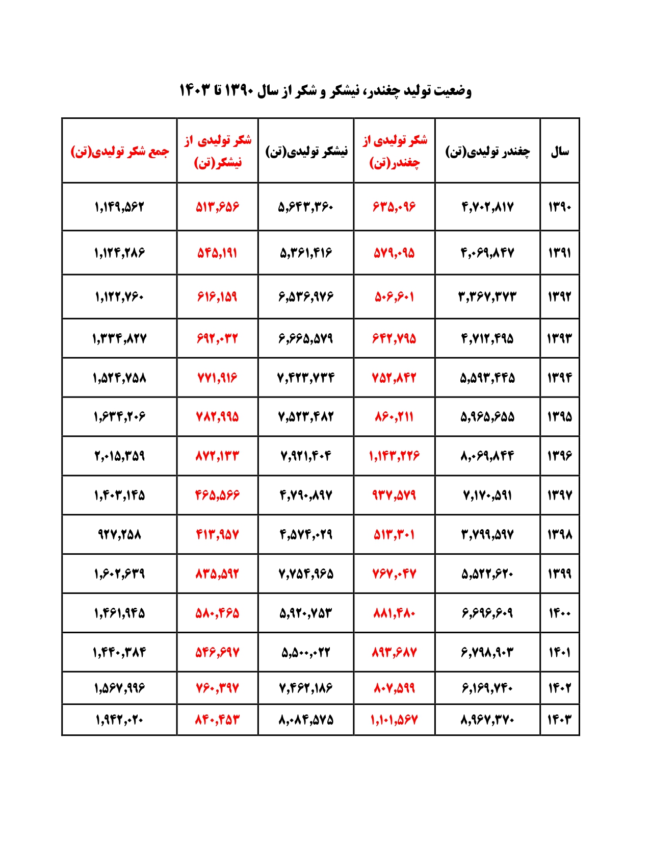 - اما از ۱۴۰۰ به بعد دوباره رشد چشمگیری رخ داد و در سال ۱۴۰۳ تولید کل شکر ایران به بیش از ۱.۹ میلیون تن رسید.